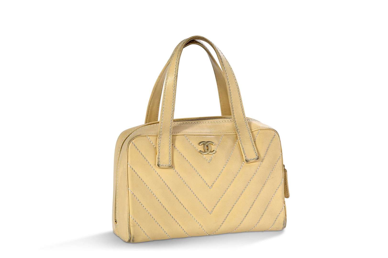 Sac en cuir matelassé beige avec garniture en métal doré. Double poignée en cuir beige.