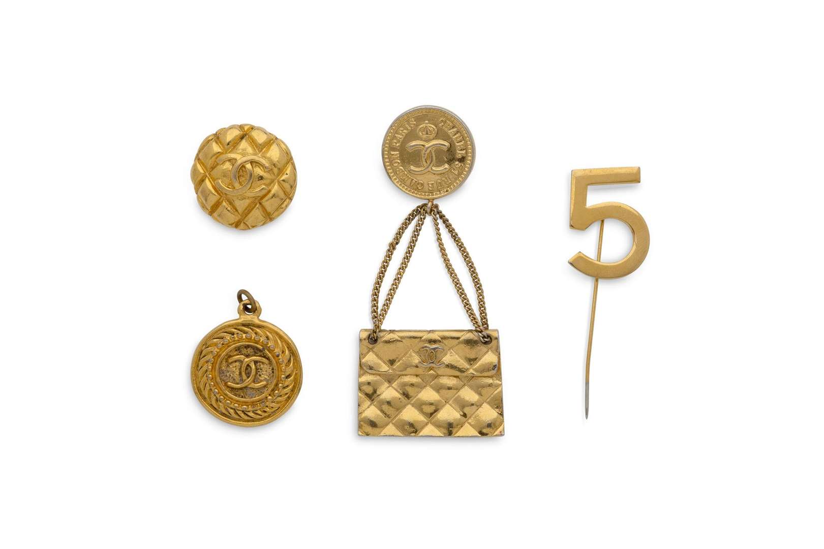 - Epingle "N°5" en métal doré. H. : 6 cm env. Signée
