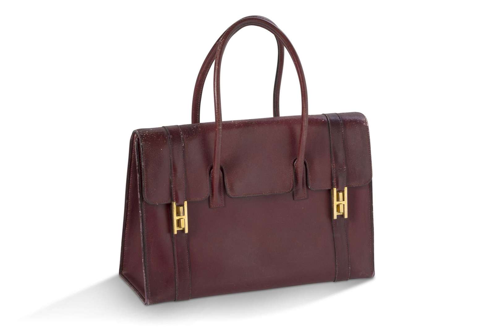 Sac en cuir bordeaux avec garniture en métal doré. Double anse pour un porté main.
