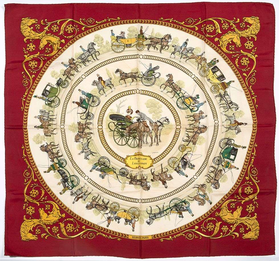 Carré de soie dessiné par Philippe Ledoux, dans les tons de rouge et de beige.