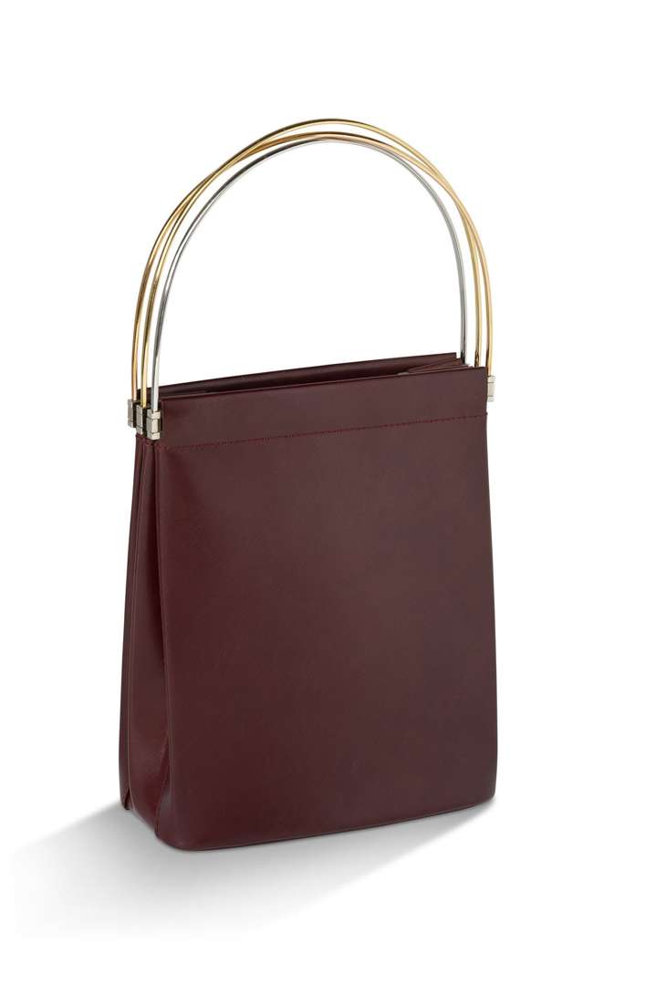 Sac à main en cuir bordeaux. Poignée en métal trois tons pour un porté main.