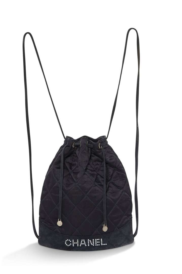 Sac à dos en satin noir avec garniture en métal argenté et perles fantaisies.