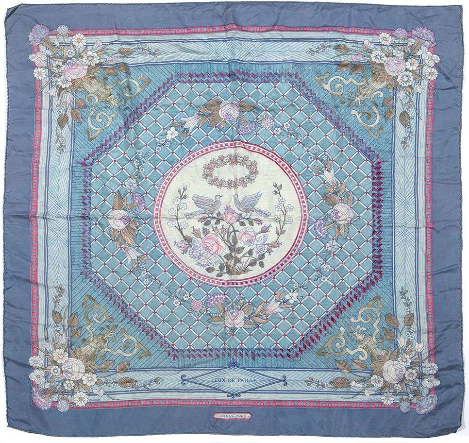 Carré de soie dessiné par Françoise de La Perrière, dans les tons de bleu et rose.
