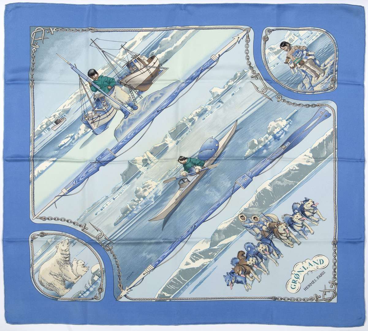 Carré de soie dessiné par Philippe Ledoux, dans les tons de bleu et blanc.