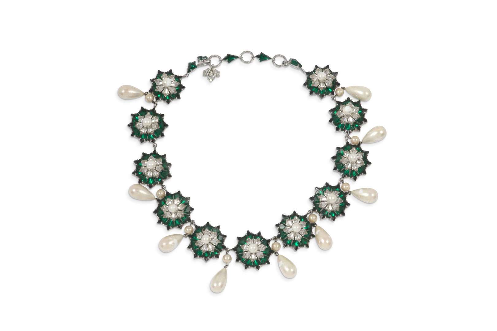 Collier "Fleurs" en métal argenté, pierres et perles fantaisies.