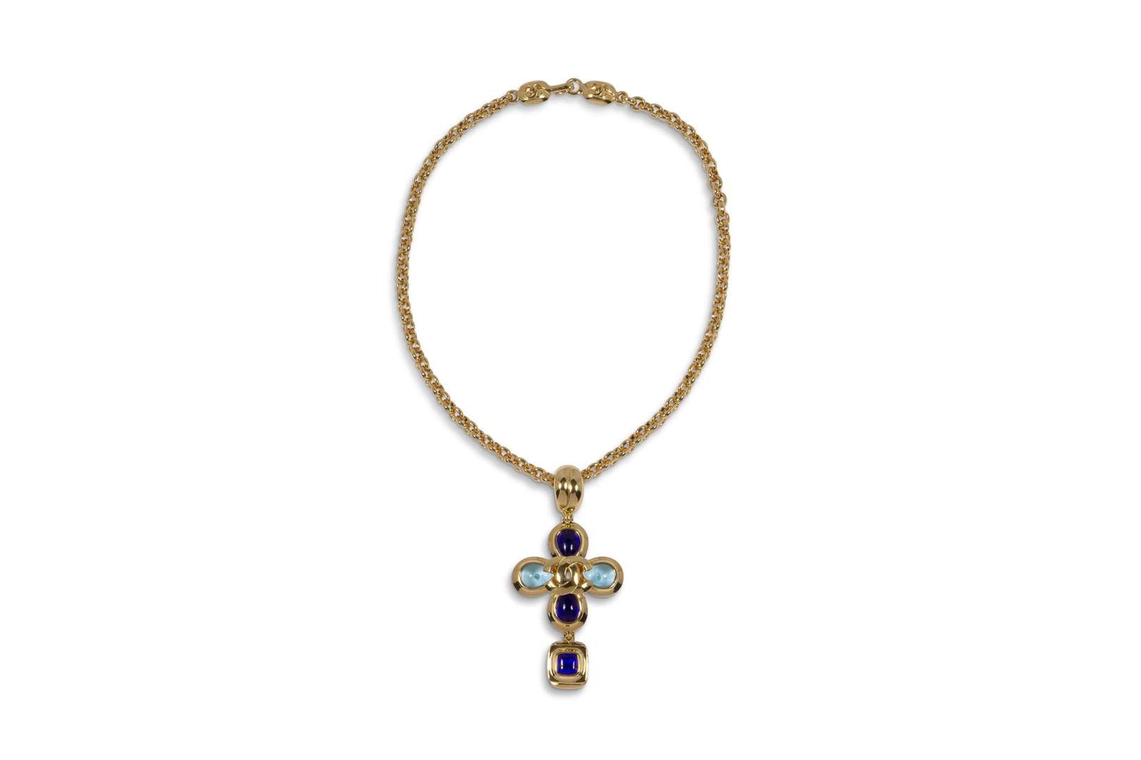 Collier "Croix" en métal doré et pierres fantaisies.