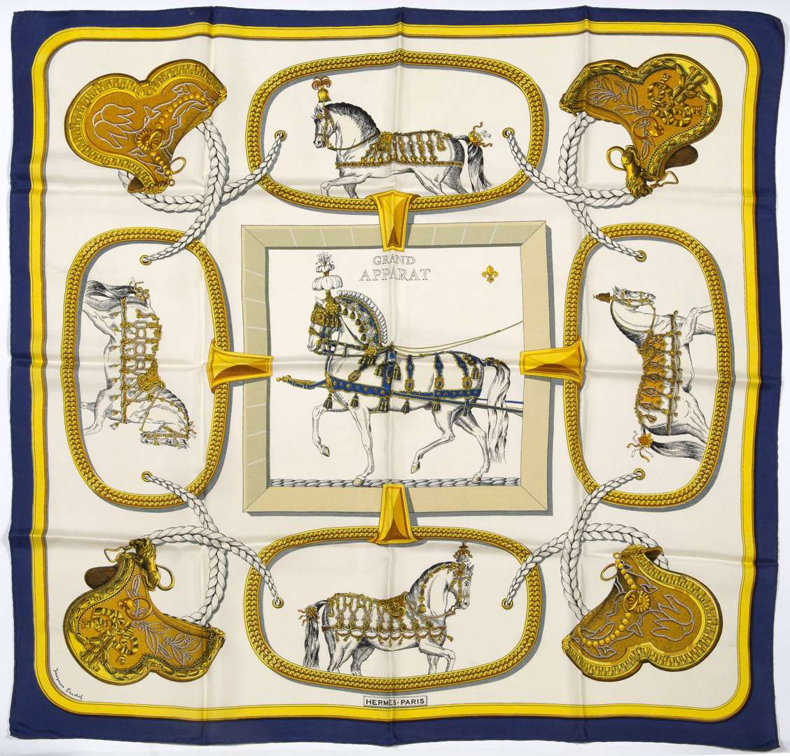 Carré de soie dessiné par Jacques Eudel dans les tons de bleu marine et jaune.