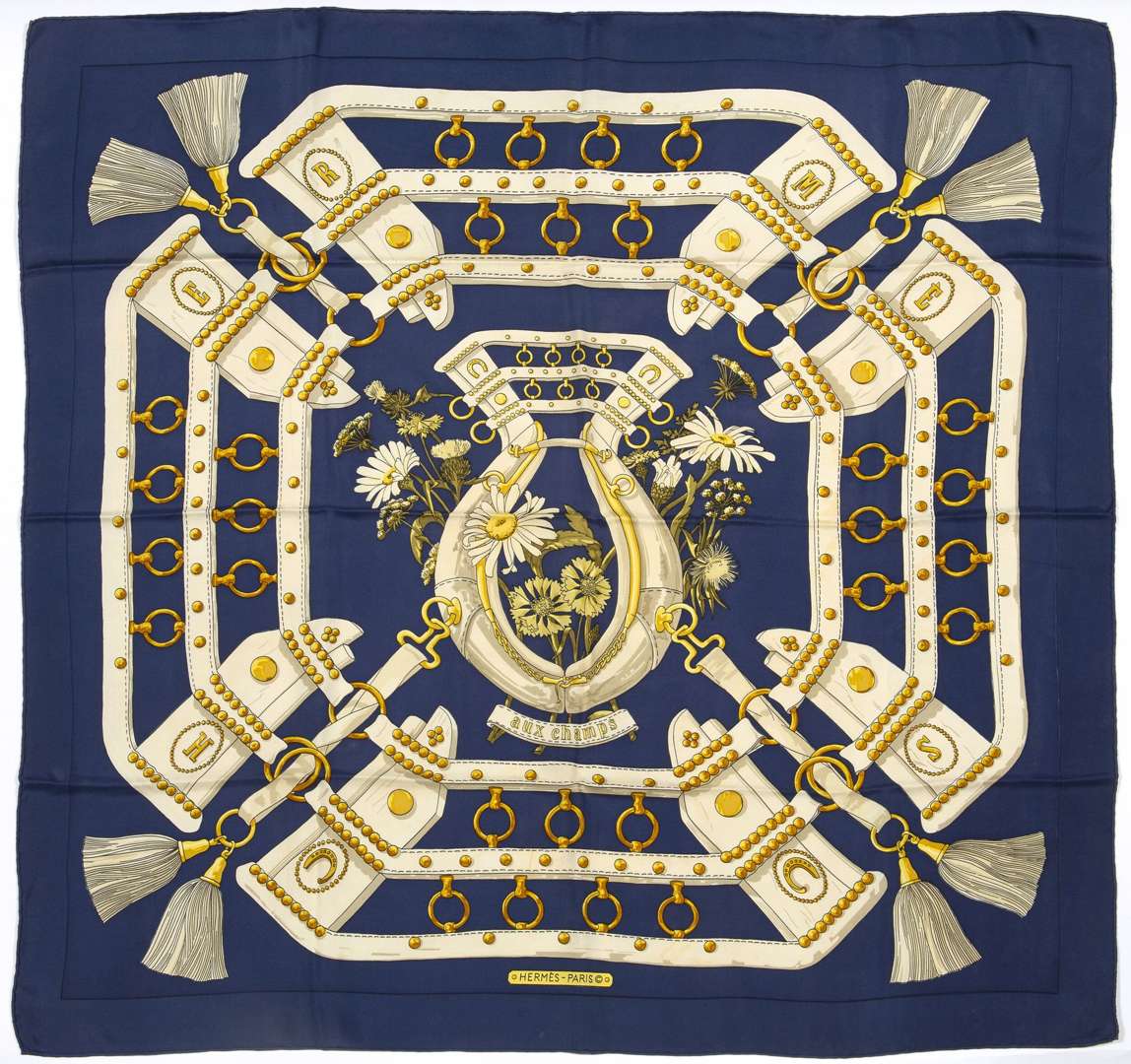 Carré de soie dessiné par Caty Latham, dans les tons de bleu et de blanc.