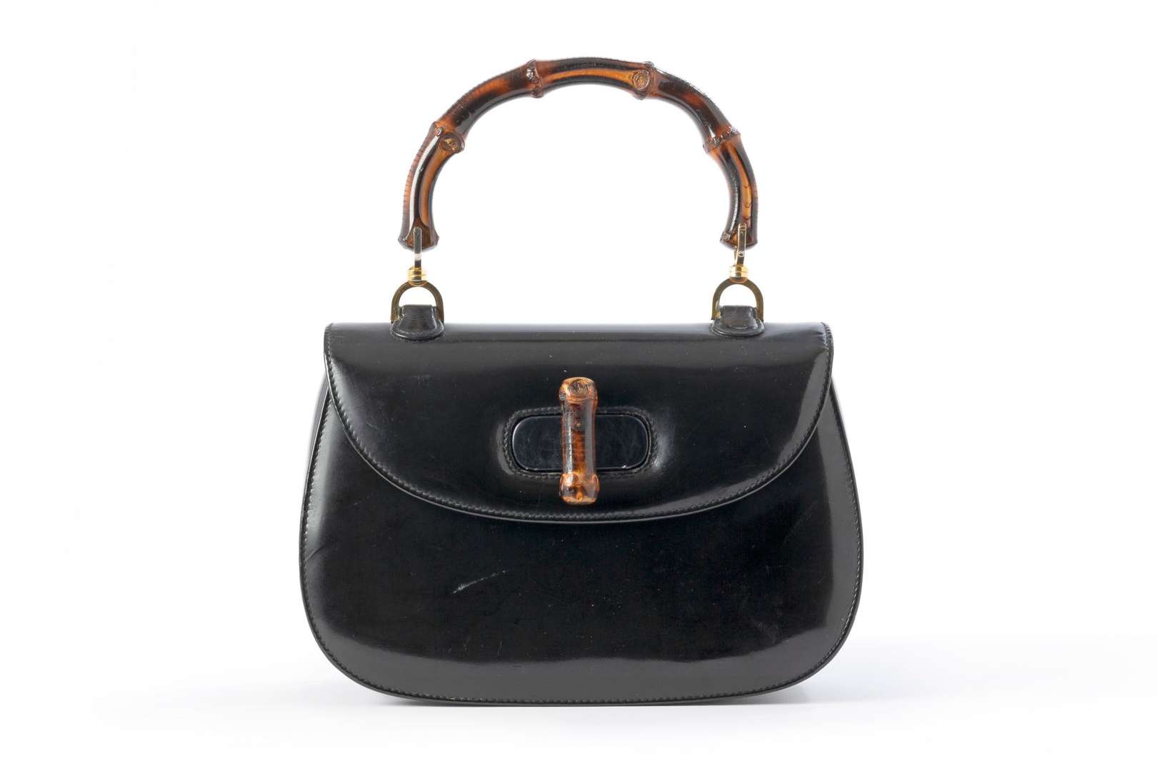 Sac en cuir vernis noir, poignée et bouton pivotant en bambou.