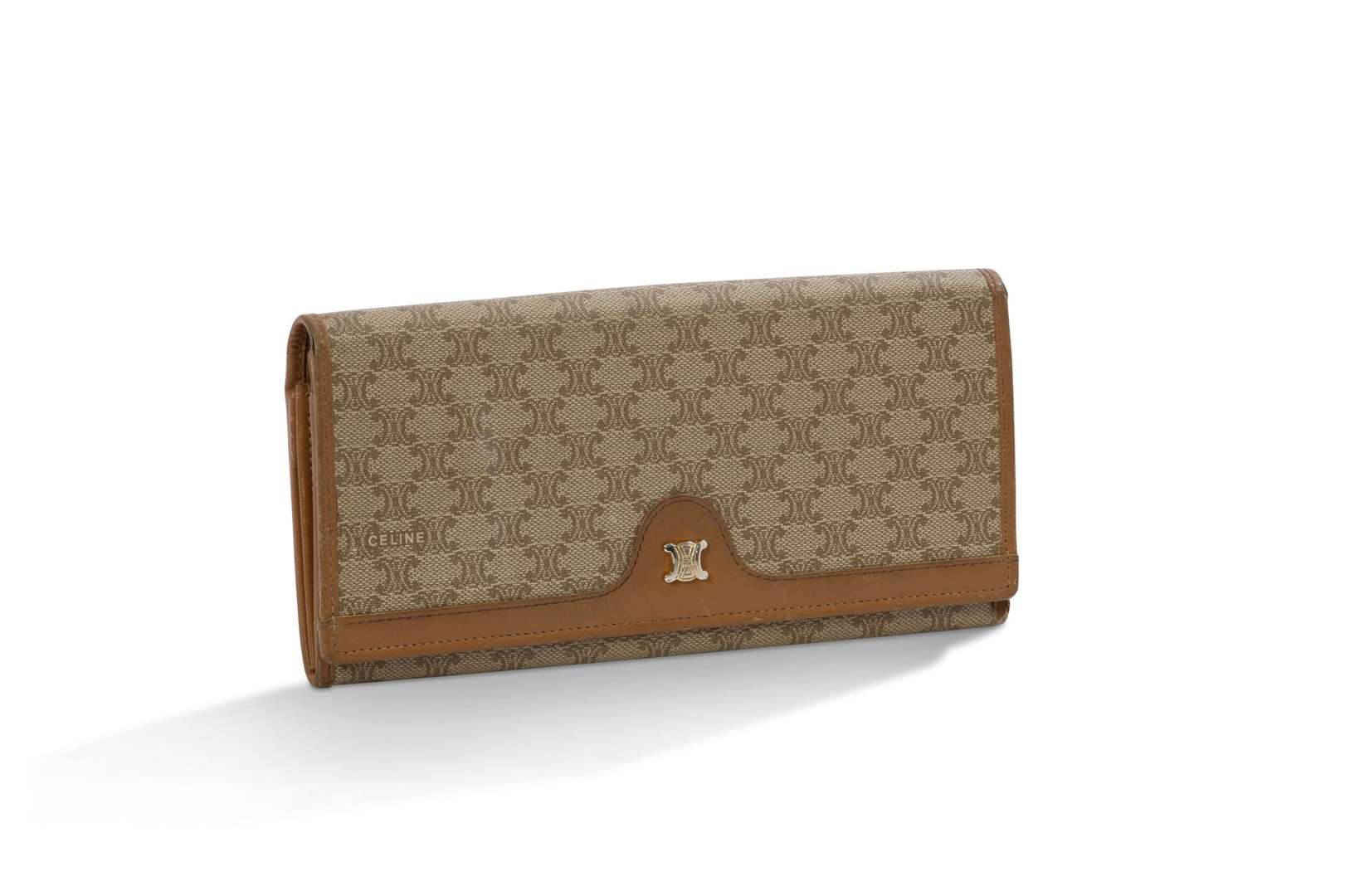 Portefeuille en toile monogrammée et cuir beige. Poche plaquée au dos.