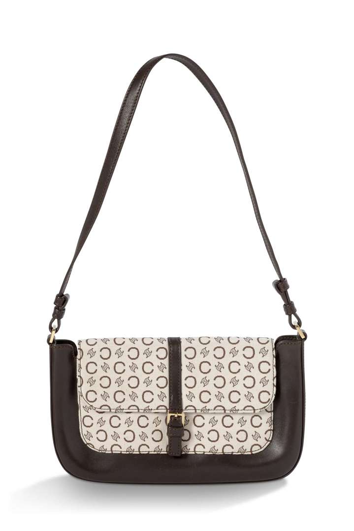 Sac en toile monogrammée beige et cuir marron avec garniture en métal doré. Anse en cuir pour un porté épaule.