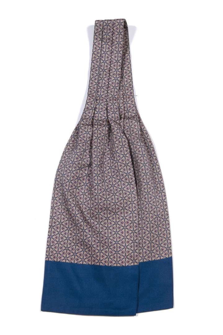 Lavallière en soie à décor géométrique dans les tons de bleu et rose.