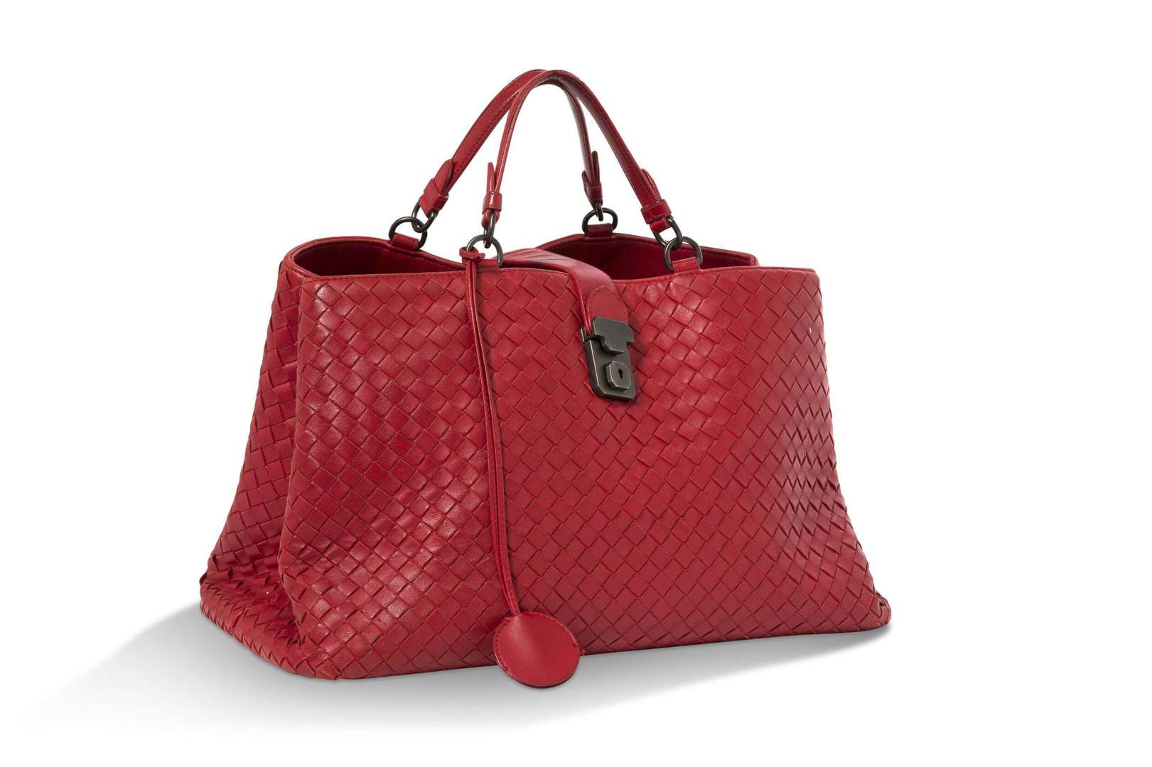 Sac en cuir tressé rouge avec garniture en métal argenté. Double poignée et bandoulière amovible en cuir.