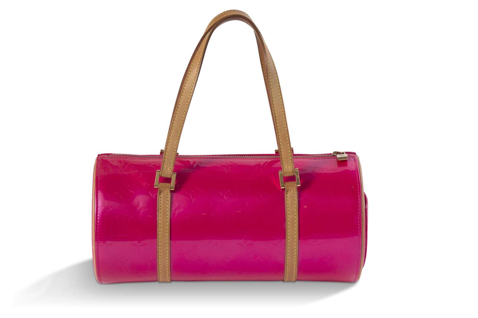 Sac en cuir vernis rose vif avec garniture en métal doré. Double anse en cuir naturel. Une poche plaquée extérieure latérale.