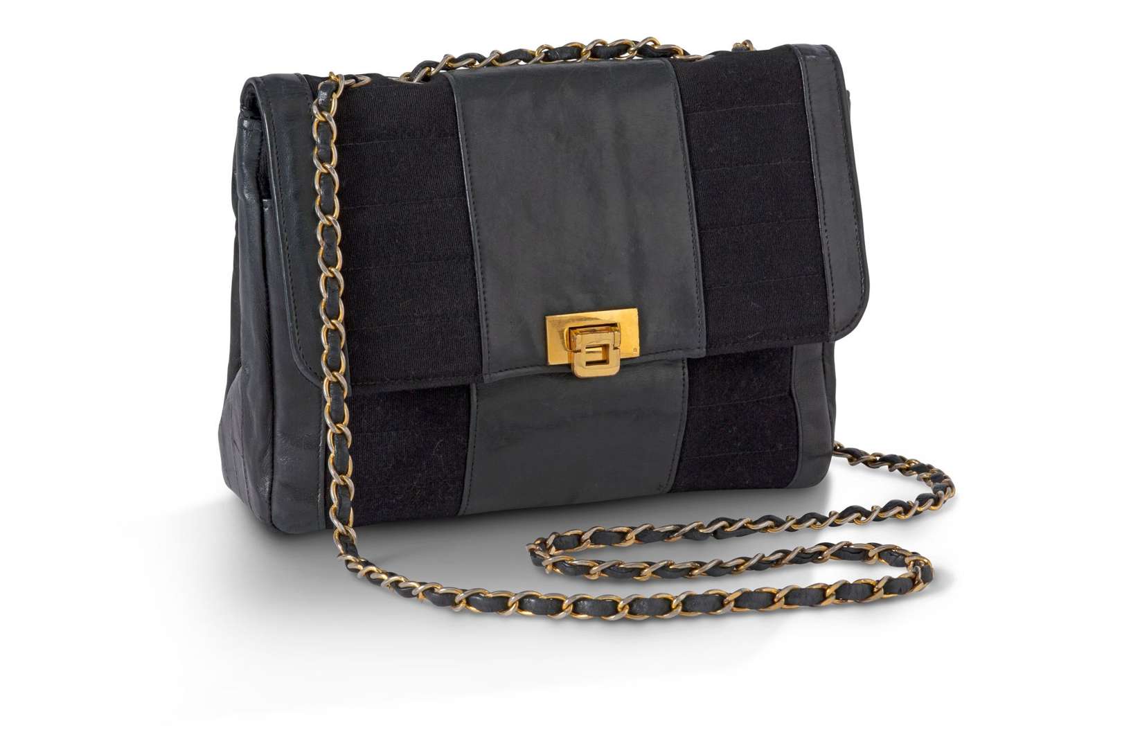 Sac en toile et cuir noir. Double anse-chaîne. Garniture en métal doré.