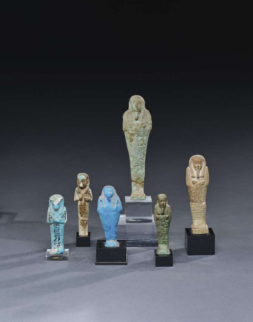 en terre siliceuse et glaçure bleue. Cinq sont épigraphiques (non déchiffrés) et un anépigraphique. Tous ont la même