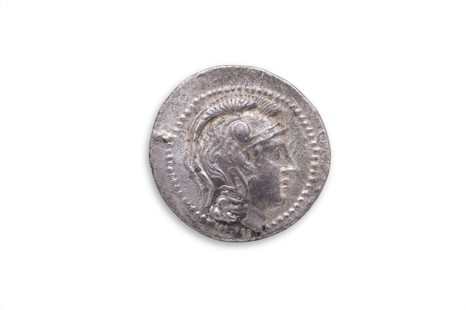 Tétradrachme, 196- 87 av JC. Argent. Av. Athéna Parthenos casquée et tournée à droite. Rv. Chouette debout à droite sur une amphore, regardant de face buste d'Hélios radié sans le champ droit un symbole sur l'amphore et à l'exergue le tout dans une couronne de laurier surmontant un arc.