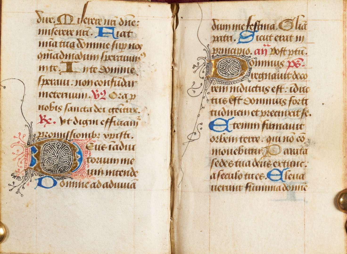 Manuscrit, nord de la France (Angers ?), deuxième moitié du XVe siècle. Volume : c. 79 x 53 mm. 160 feuilles de vélin. Collation : 16, 27 (6+1), 312, 47(6+1), 58, 69 (8+1), 77(1+4+2), 87(6+1), 910, 107(6+1), 116, 1212, 134, 143(2+1), 156, 167(6+1), 1712, 184, 1912, 206, 218. Surface d’écriture : c. 53 x c. 30 mm. 14 lignes, 1 colonne, réglées en brun rougeâtre. Écriture bâtarde à l’encre brun foncé ; calendrier en rouge, bleu et brun ; rubriques en rouge ; capitales touchées en jaune ; le scribe jouant parfois avec les ascendants pour créer des cœurs et autres boucles décoratives. - Des centaines d’initiales à une ligne en feuille d’or et en bleu alternés ; des douzaines d’initiales à deux lignes en bleu avec des tracés filigranes rouges alternant avec des initiales en feuille d’or remplies de tracés filigranes noirs ; le décor de tracés monte parfois le long des bordures ; six initiales à trois lignes en feuille d’or et en bleu avec des tracés filigranes rouges et noirs ; des remplissages de fin de ligne en feuille d’or et en bleu, sous forme de barres ou de formes florales ; des blancs indiquent des miniatures prévues mais non exécutées et des initiales décorées à des sections de texte importantes (ff. 14, 18v, 25, 51v, 53v, 89, 111, 153, 154, 155v, 157, 158v, 159v). - L’ensemble était émargé sur les bords lors de la reliure ; parchemin quelque peu fragile avec quelques craquelures à la gouttière ; certains feuillets des deuxième et troisième cahiers (à partir des ff. 13-24) mal reliés ; taches à travers les ff. 45v-46 ; abrasion à l’initiale et écaillage à la feuille d’or au f. 154v ; plusieurs initiales avec saignement d’encre, obscurcissant les tracés, probablement à cause de l’exposition à des liquides ; taches brunes minimes à la fin du livre (dernier cahier). - Reliure en velours violet avec de légères marques d’usure, bords en rouge. UN PETIT LIVRE DE PRIÈRES À L’USAGE D’ANGERS, REMPLI DE JOLIES LETTRES FILIGRANÉES. UNE SÉRIE DE MINIATURES AVEC DES INITIALES DÉCORÉES ET RELIÉES ENTRE ELLES ÉTAIT PRÉVUE POUR CE LIVRE MAIS N’A JAMAIS ÉTÉ EXÉCUTÉE. À LA FIN DU XVIIIe OU AU DÉBUT DU XIXe SIÈCLE, LE LIVRE EST ENTRÉ DANS LA COLLECTION ESTIMÉE DU BIBLIOPHILE, EXPERT EN COSTUMES ET RÉDACTEUR DU JOURNAL DES DAMES ET DES MODES, PIERRE DE LA MÉSANGÈRE. PROVENANCE Réalisé à l’usage d’Angers avec des saints angevins présents dans le calendrier et la litanie. L’Obsecro te utilise la forme masculine de famulo tuo ; Pierre de la Mésangère (1761 - 1831), fondateur et rédacteur du Journal des dames et des modes ; vendu à Paris par De Bure Frères en 1831 ; Mondidier, Henri de Varenne, son no. 3714, d’après la note sur le premier contre-garde, qui se lit comme suit : « N°3714 de la bibliothèque de Henri de Varenne (acheté à Paris 1831). Ce petit livre a appartenu à M. de la Mésangère, dont la signature autographe se trouve à la fin. Les manuscrits sur vélin, dans un si petit format, sont assez rares. Ce petit manuscrit ne contient que (?) d’Eglise. Henri de Varenne à Mondidier » ; Europe, collection privée. TEXTE - ff. 1-12v : Calendrier, avec SS. Licinus, évêque d’Angers (13 février), Albinus, évêque d’Angers (1er mars), Maurilius, évêque d’Angers (13 septembre), Renatus, évêque d’Angers (12 novembre). - f. 13 : Fin erronée de Obsecro te (devrait suivre le f. 24) : ...as et suscipias et vitam eternam michi tribuas. Audi et exaudi me dulcissima Maria mater dei et misericordie. Amen. - f. 13r/v : Salve regina. - f. 14r/v : Stabat mater dolorossa...supplico (le reste du texte suit au f. 23). - ff. 15-17 : Extrait de l’Évangile de Jean. - ff. 17v-22v : Obsecro te (famulo tuo en forme masculine), jusqu’à (le reste mal relié au f. 13) : Et hanc orationem supplicem exaudi... - f. 23-24 : Suite du Stabat mater du f. 14v :... Quis non posset. - ff. 25-87v : Heures de la Vierge avec intégration des Heures de la Croix et des Heures du Saint-Esprit : Heures de la Vierge : (f. 25), Matines, (38v), Laudes ; Matines : (f. 52) Heures de la Croix, (f. 53v) Heures du Saint-Esprit ; Prime : (f. 54v) Vierge, (f. 61) Croix, (f. 61v), Saint-Esprit ; Terce : (f. 62) Vierge, (f. 66) Croix, (f. 66v) Saint-Esprit ; Sixième : (f. 67) Vierge, (f. 71) Croix, (f. 71- 71v) Saint-Esprit ; Sixième : (f. 67) Vierge, (f. 71) Croix, (f. 71-71v) Saint-Esprit ; None : (f. 71v) Vierge, (f. 75v) Croix, (f. 76) Saint- Esprit ; Vêpres : (f. 76v) Vierge, (f. 80) Croix, (f. 80v) Saint-Esprit ; Complies : (f.. 80v) Vierge, (f. 86v) Croix, (f. 87) Saint-Esprit. - f. 88 : blanc ligné. - f. 88v-104v : Psaumes de pénitence. - ff. 104v-110v : Litanie : y compris SS. Maurillius et Renatus. - ff. 111v-152v : Office des morts : (f. 111v) Vêpres, (f. 117) Matines, (f. 147) Laudes. - ff. 153-160 : Suffrages des saints : (f. 153) Michel, (f. 154) Christophe, (155v) S