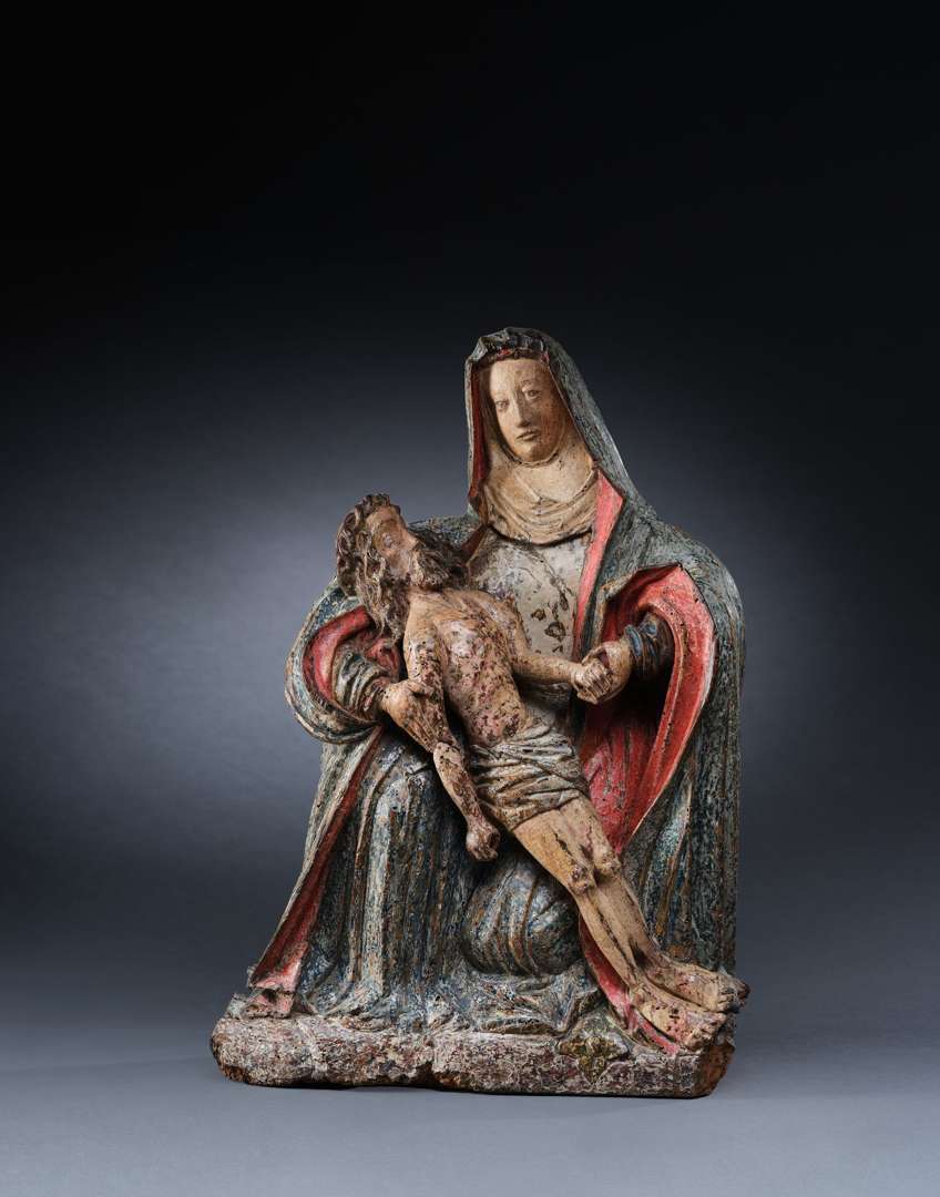 en bois sculpté et peint polychrome. La Sainte Vierge Marie est assise et tient son Fils mort appuyé sur son genou droit.