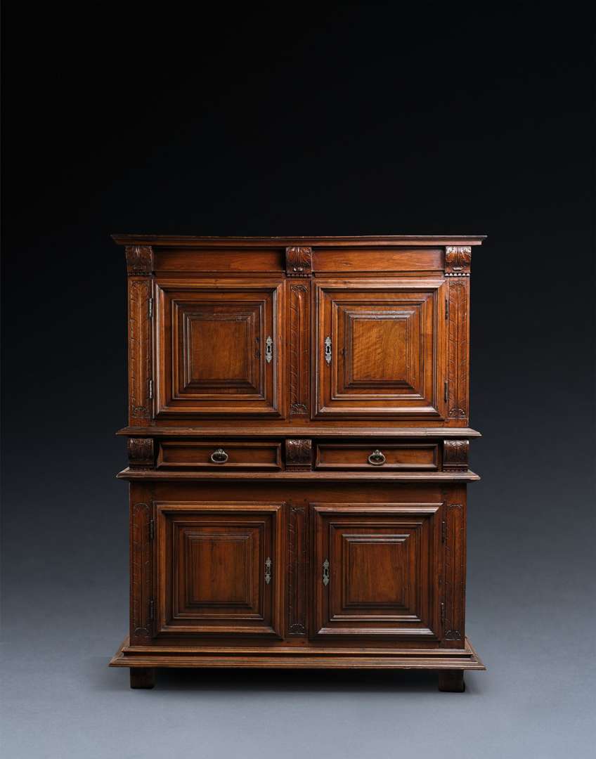 à deux corps sans retrait en noyer mouluré d'encadrements pyramidaux. La façade ouvre par quatre vantaux, et quatre tiroirs en ceinture. La corniche et les encadrements des tiroirs ornés d'agrafes à volutes sculptées. Les montants et faux dormants à décor de pennes d'oiseaux.