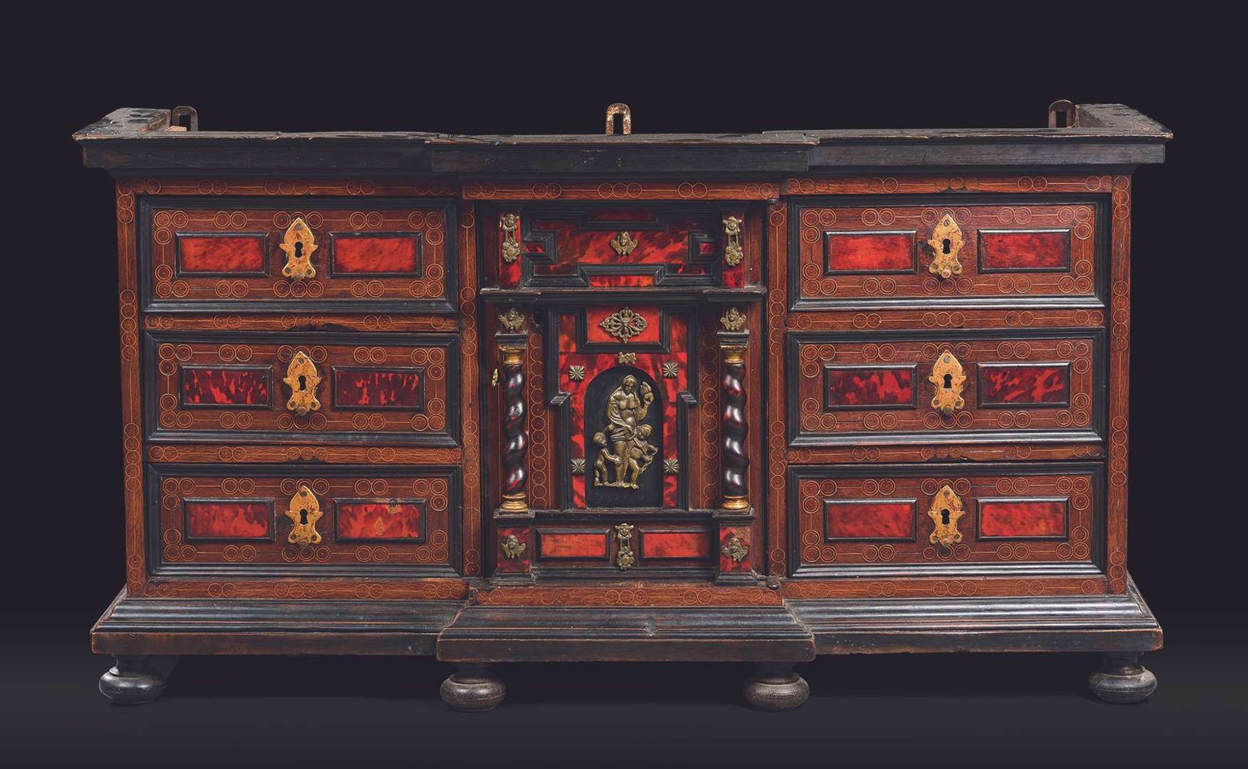 en placage d'écaille rouge, la façade ouvrant par six tiroirs et un vantail central découvrant quatre tiroirs, repose sur des pieds boules. Ornementations de laiton vernis à sujet central d'une allégorie de la Charité.
