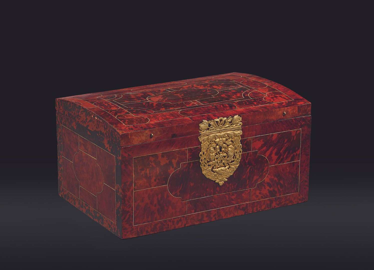 plaqué d'écaille rouge sur une âme de sapin, quatre faces plaquées, le couvercle légèrement bombé à décor de cartouches. Belle entrée de serrure en cuivre repoussé et doré à décor floral.