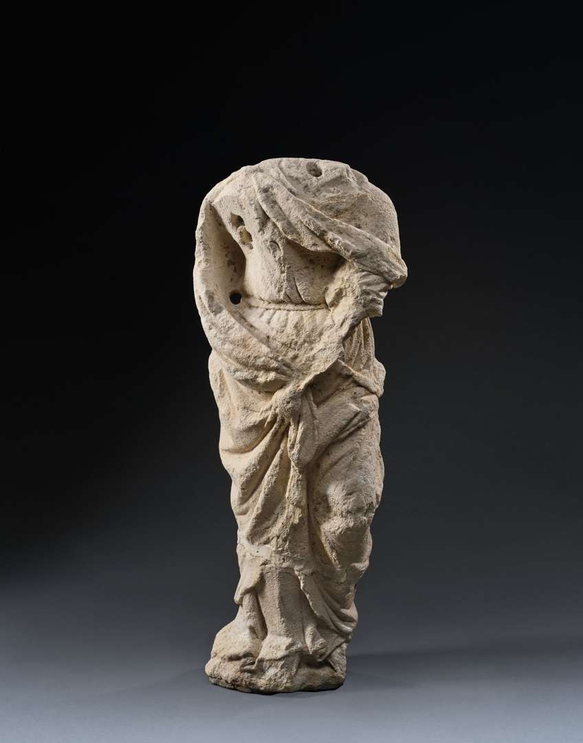 en pierre sculptée calcaire, le corps de la figure drapé à l'Antique, retenant un pan de son vêtement de sa main gauche.