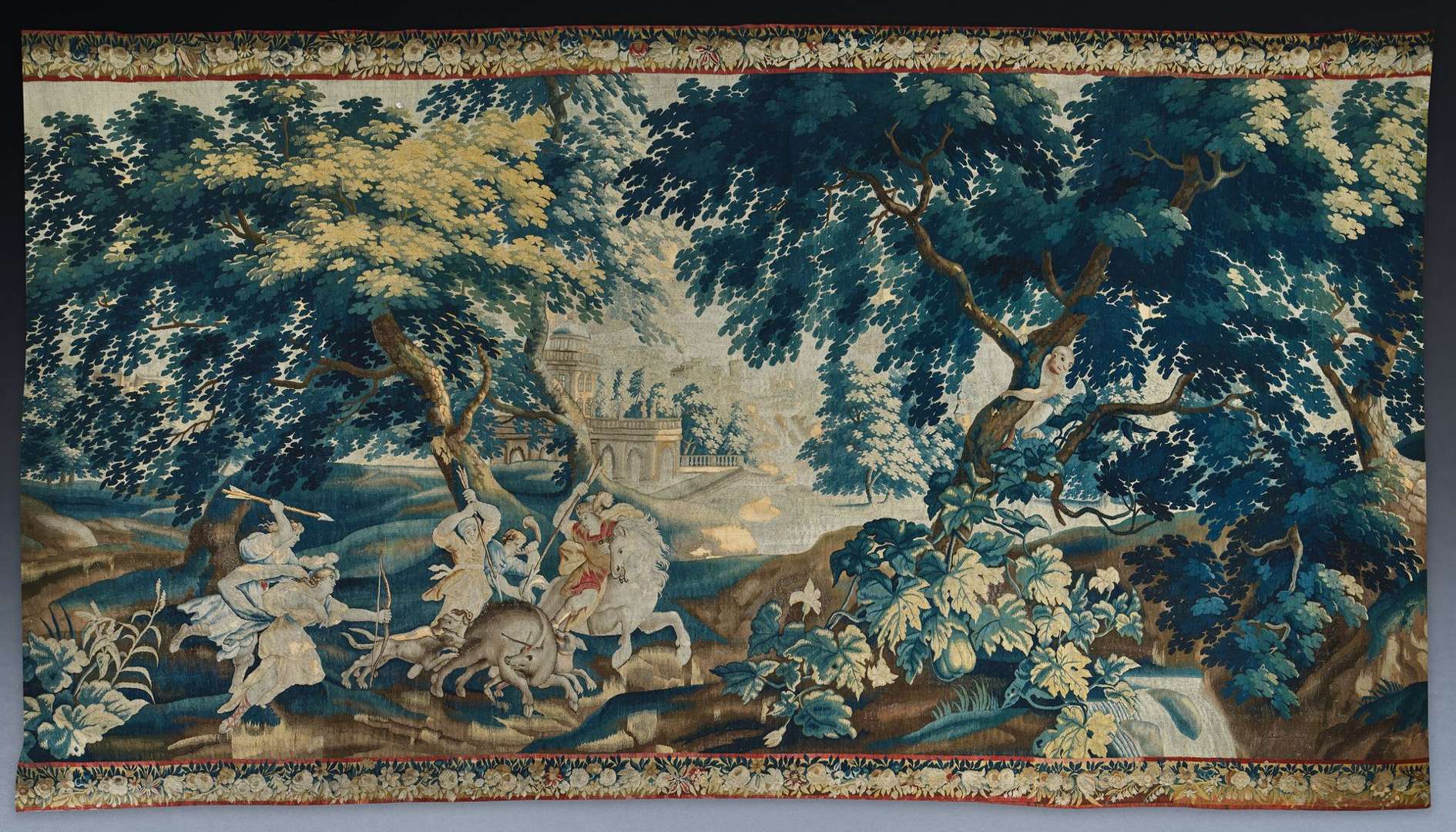 Tapisserie de laine polychrome représentant la chasse du sanglier de Calydon, dans un paysage architecturé et de verdure. Au premier plan un petit singe se tient dans un arbre devant lequel sont des coloquintes. Flandre, probablement Bruxelles, XVIIIe siècle Hauteur : 234 cm - Largeur : 416 cm (coupée, légèrement insolée et bordure probablement rapportée).