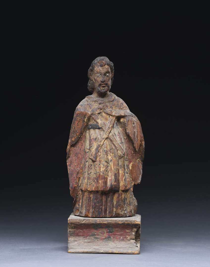 en bois sculpté et peint polychrome, les yeux incrustés en verre. Il se tient debout et porte soutane, soutanelle, étole croisée sur l'avant et chasuble.