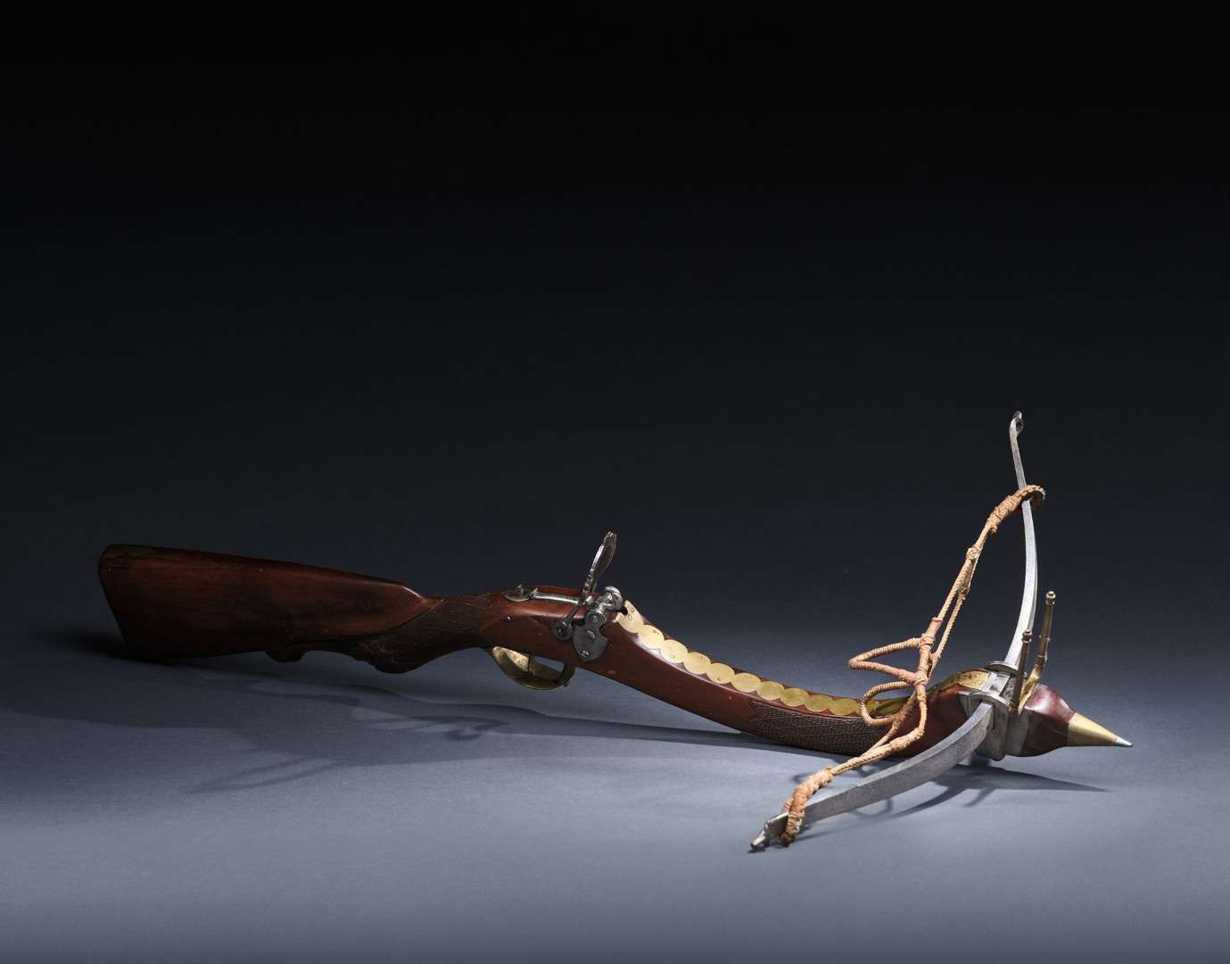 Arc en fer forgé de 49 cm. Corde avec fronde ancienne. Plaque de couche en laiton.