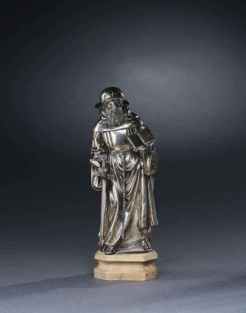 Figure d'applique en argent repoussé, le Saint est représenté debout en tenue de franciscain par-dessus son armure, coiffé d'un casque, tenant de sa main droite une épée et de sa main gauche un livre ouvert.