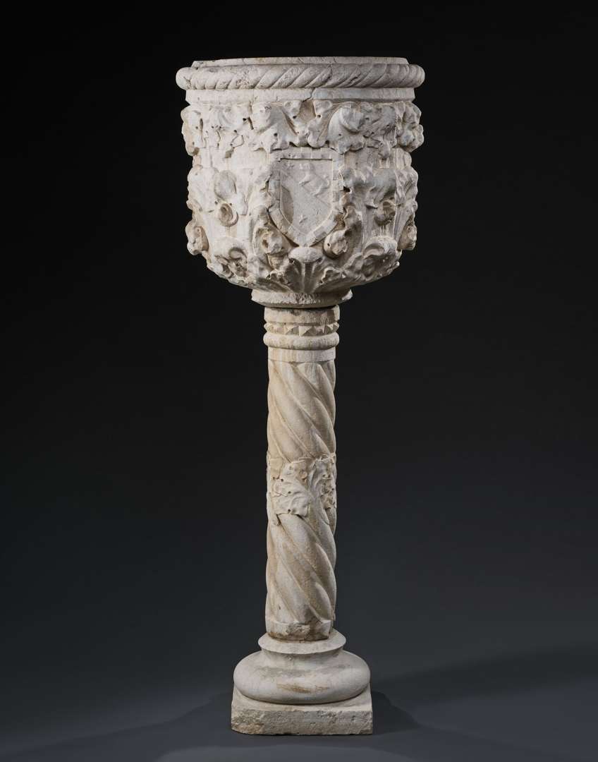 en pierre sculptée circulaire à riche décor en relief de contournements en feuilles de choux et aux armoiries sculptées (non identifiées) sur la panse. Frise torse en partie supérieure. Trou d'écoulement au fond.