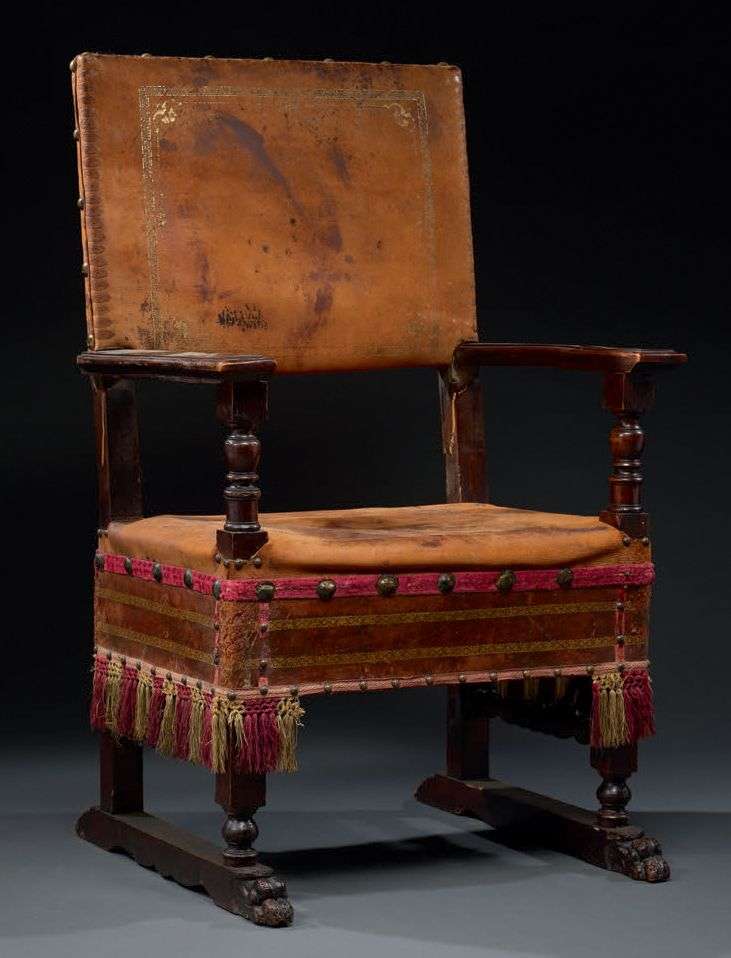 en bois de noyer et bois de résineux. Les patins terminés par des pattes de lion. Garniture à jupe en cuir doré aux petits fers et galon de velours cramoisi clouté de cuivre.