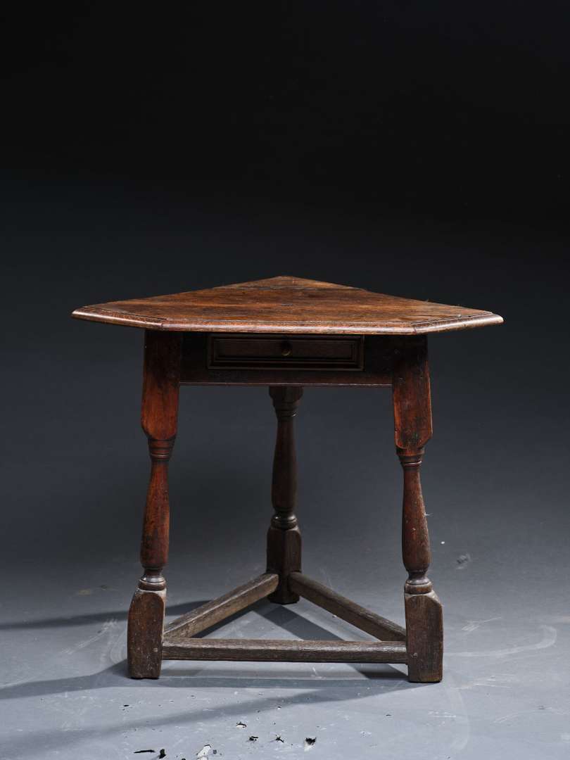 en bois de chêne. Le plateau de forme pentagonale sur un piètement de forme triangulaire à ceinture ouvrant par un tiroir et reposant sur trois pieds tournés en balustre reliés par des entretoises.