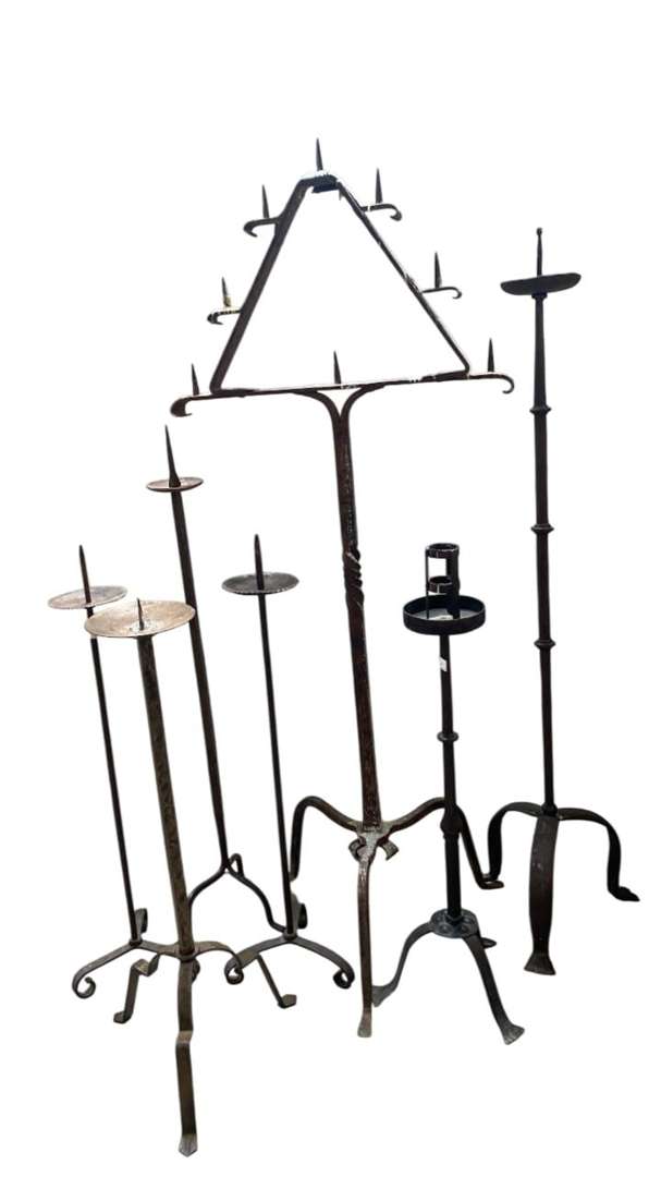 - Deux pique-cierges en fer forgé à piètements tripodes.