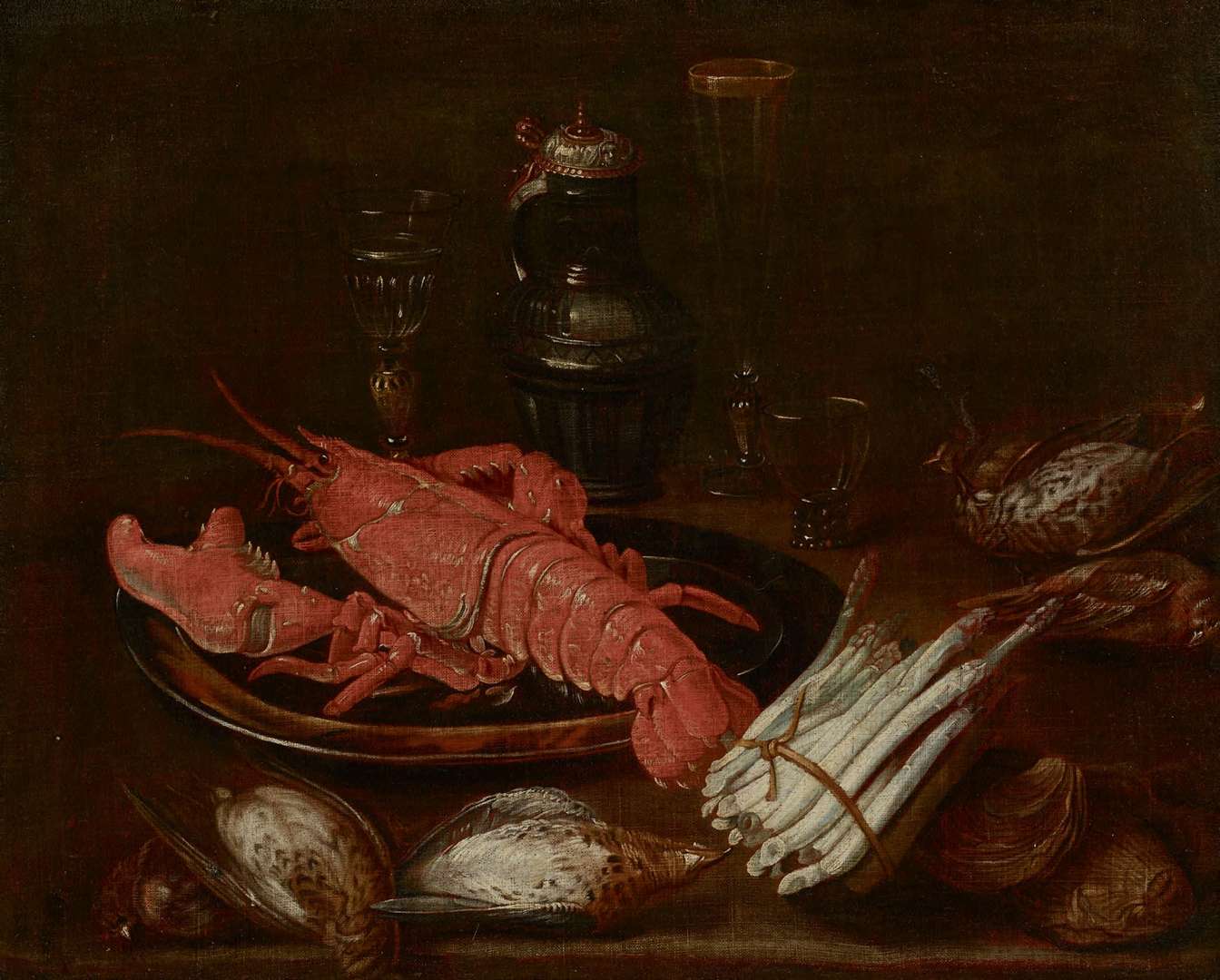 Nature morte au homard, grives, huîtres, dinanderie et verrerie