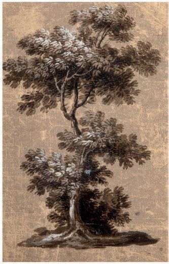 Lavis brun et gouache blanche sur papier préparé en brun