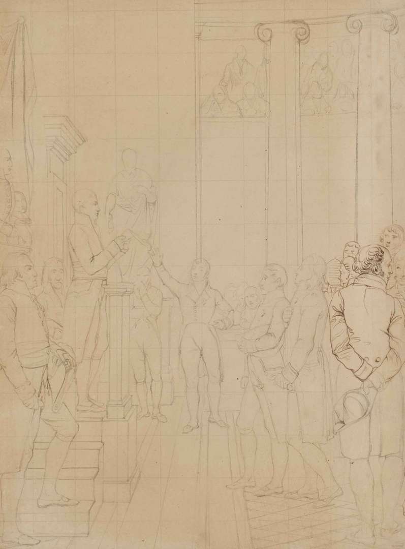 Plume, encre brune et pierre noire avec mise au carreau