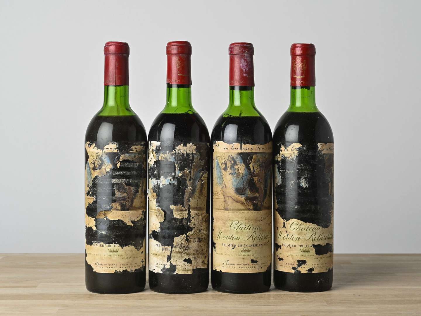4 B CHÂTEAU MOUTON ROTHSCHILD (2 H.E.+| 2 H.E| 1 e.t.a| 3 e.q.i. fragiles en grande partie absentes| 1 c.c.) - 1973 - GCC1 Pauillac