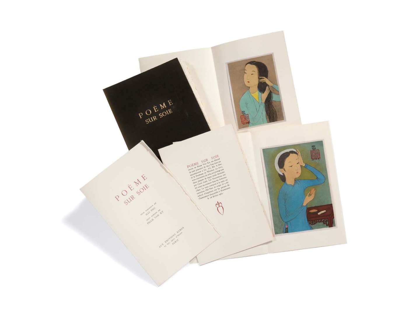 Collection of eight poems by Phạm Văn Ký illustrated with eight silk reproductions by Mai Trung Thứ. In a black silk cover and black hardback slipcase, bears no. 492/550. Éditions Euros, Paris, Ateliers L'Ibis and imprimerie Daragnès, Paris, 1961
