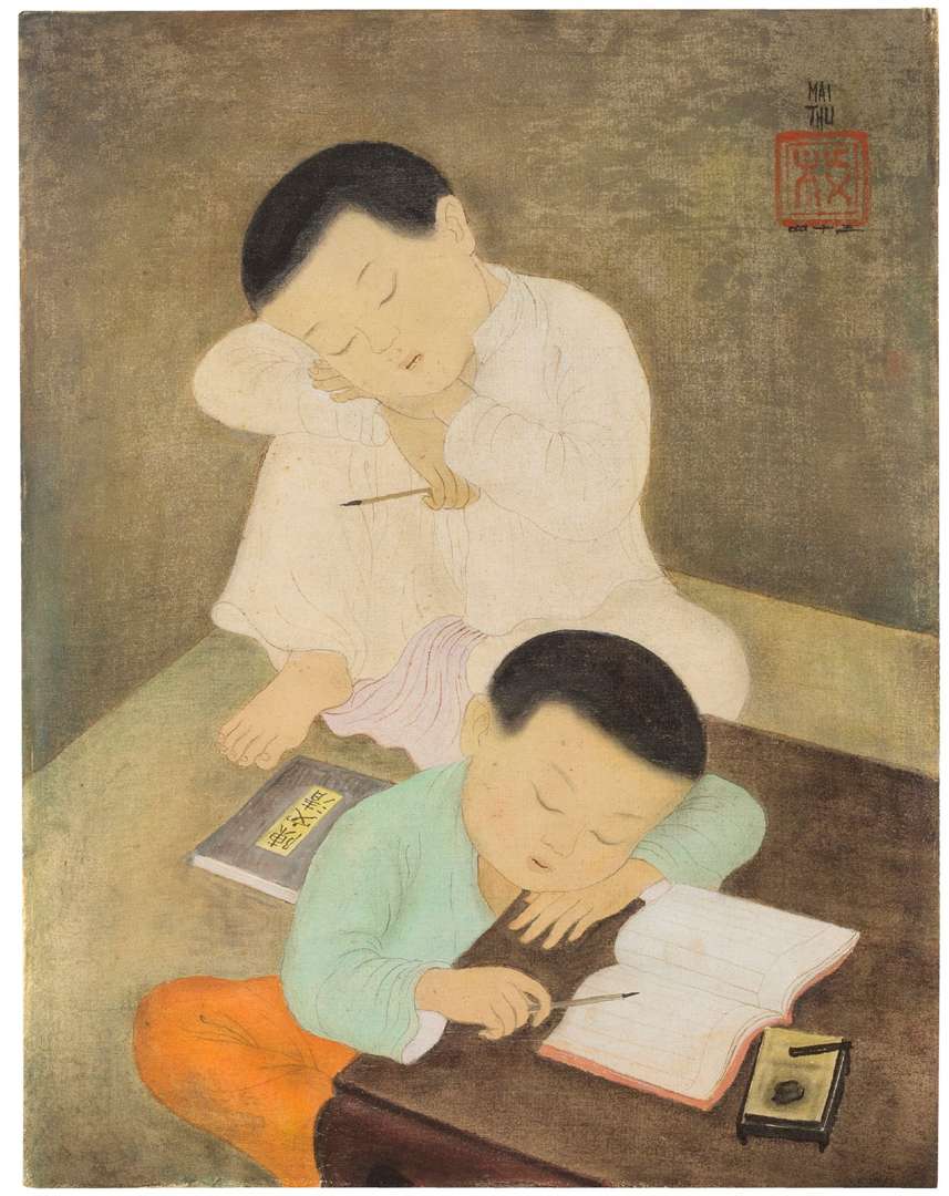 Enfants endormis est une soie typique du travail de Mai Trung Thứ au début des années 1940, lors des expositions données en Algérie et également à Casablanca. Acquise à la Galerie L'Art Vivant et transmise familialement par la suite, cette soie illustre deux écoliers, représentés dans une composition pyramidale. Ici, les jeunes garçons se sont endormis alors qu’ils étudiaient. Aux pieds de celui vêtu de blanc se trouve un cahier sur lequel est noté son nom : Chen Wen Qin.