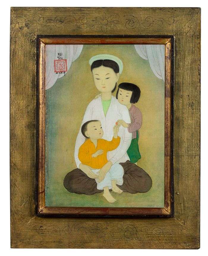 La tendresse maternelle est l’un des thèmes de prédilection de Mai Trung Thứ. Ici, une mère regarde tendrement son fils qu’elle tient, assis sur ses genoux, tandis que sa fille, derrière elle tend un fruit à son petit frère. Les couleurs vives apportent beaucoup de gaieté à cette composition.