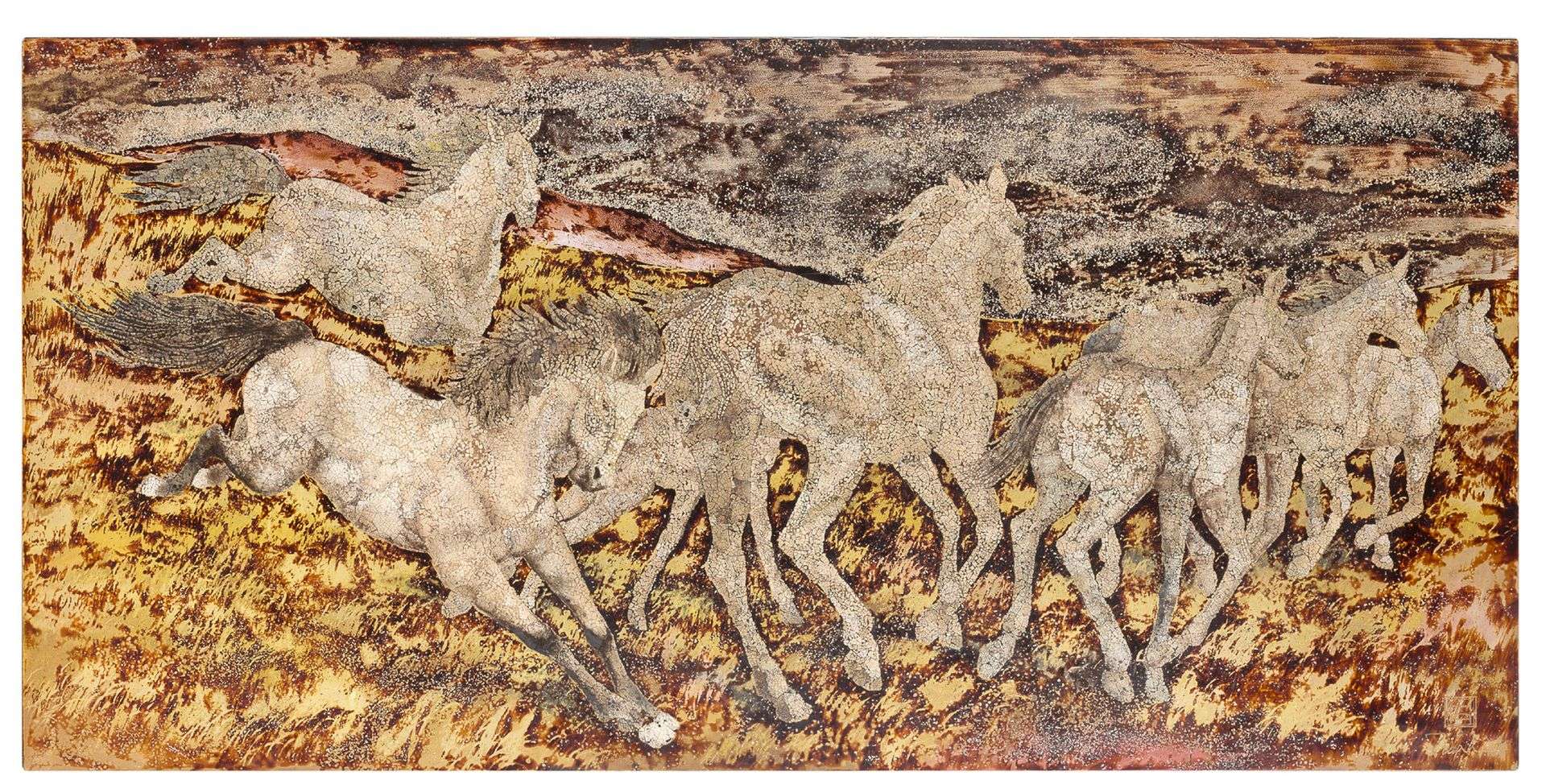 Laque, coquilles d'oeufs et nacre pillée, un panneau, signé en bas à droite