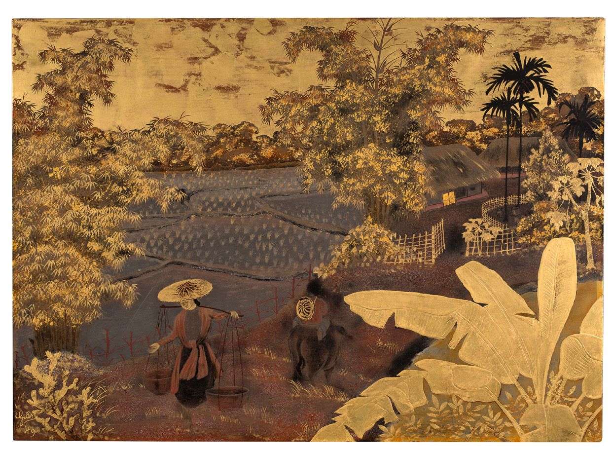 Laque à rehauts d'or et de nacre pillée, un panneau, porte une signature Gian et une date 1949 en bas à gauche