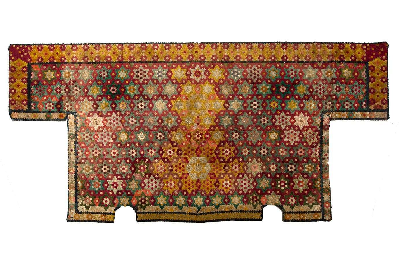 Champ grenat à décor de rangées de fleurs étoilées polychromes. Bordure jaune d'or.