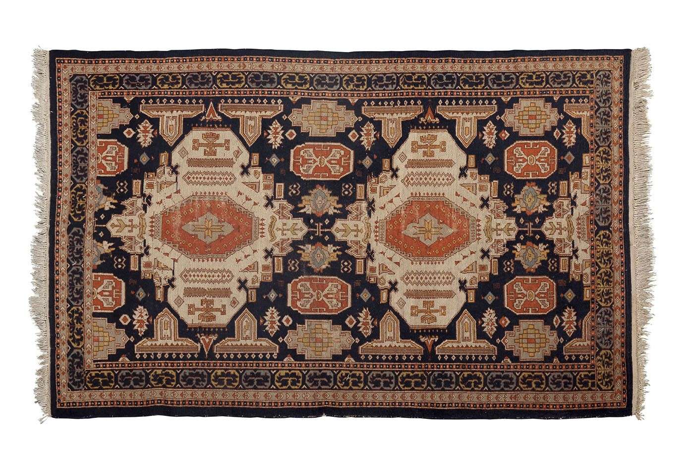 Velours de laine sur fondations en coton. Champ bleu nuit à décor géométrique.