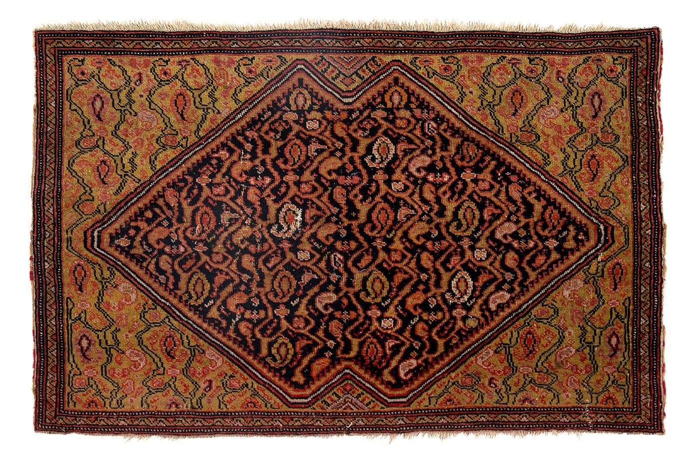 Velours de laine sur fondations en coton. Champ jaune d'or à décor de semis et réserves incrustées de botehs stylisés en forme de mosaïque orné d'un large médaillon central bleu nuit à motifs rappelant le champ central formé de semis de botehs et boutons floraux polychromes, en forme de diamant biseauté.
