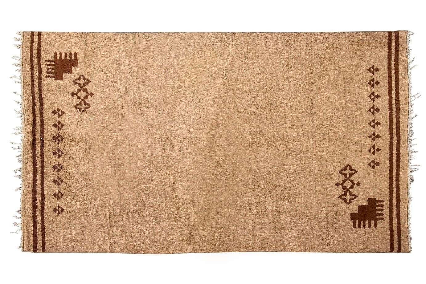Velours de laine sur fondations en coton. Champ beige uni à décor de double bande brun anthracite en symétrie entourées de rangées de fleurs stylisées géométriquement et peignes stylisés.
