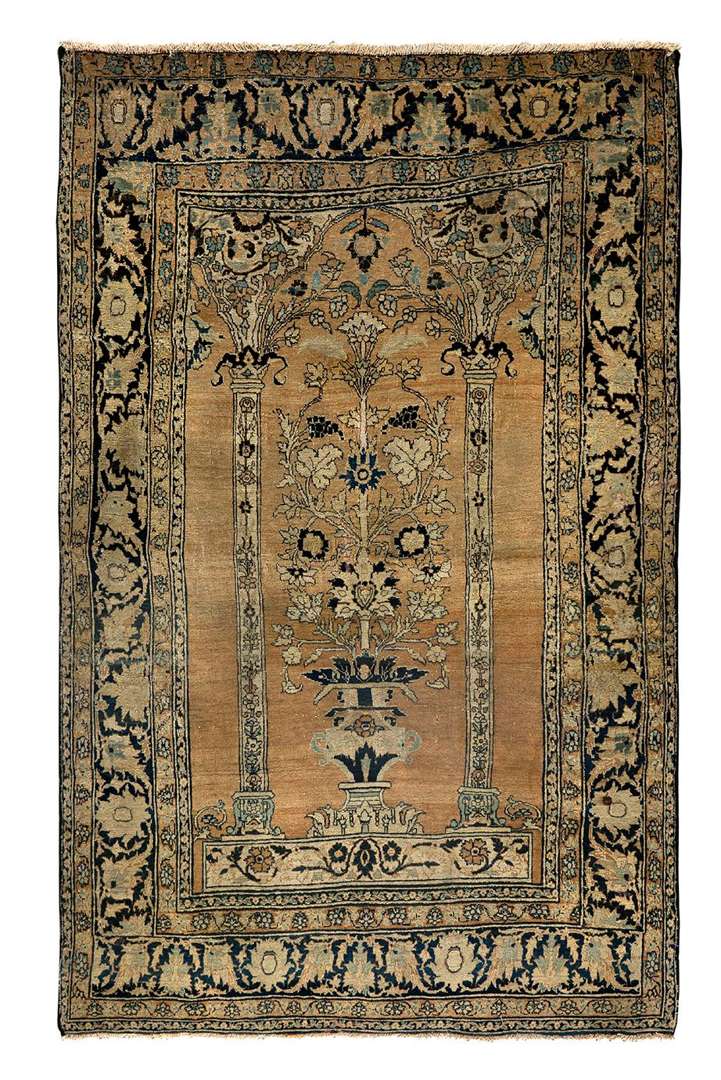 Velours de laine soyeuse de qualité sur fondations en coton. Champ brique à décor d un Mirhab, lampe à huile suspendue, double colonnes encadrant un vase à bouquet richement fleuri. Bordure principale bleu nuit à semis de palmettes.