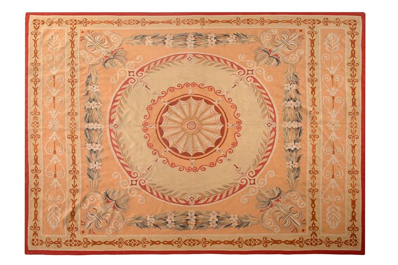 Aux fils de laine sur fondations en coton. Champ rose saumoné pâle à décor d'une large rosace centrale fleurie entourée de guirlandes de cordons de feuillages et fleurs stylisées à tonalités pastel.